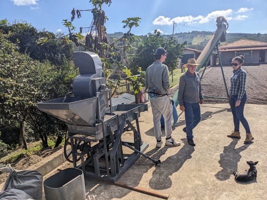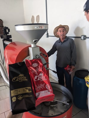 Er erwähnt, dass er selbst auch eine Röstmarke hat und wir besichtigen die Rösterei. Das hatten wir wirklich nicht erwartet. In der kleinen Halle hinter dem Haus befindet sich eine 10kg Carmomaq Röstmaschine mit der Ozório Santos und Andere, wie es auf der Verpackung heißt, handwerklich Kaffee rösten.
