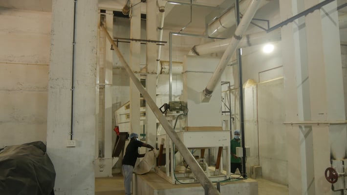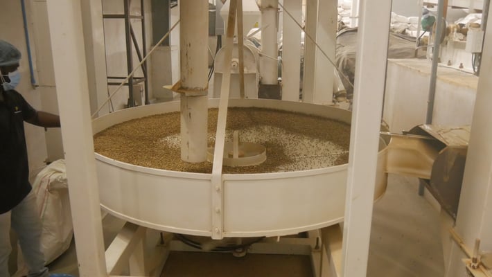 Mr. George zeigte mir das Gelände, Schwan kannte dieses natürlich schon sehr gut, kam aber trotzdem mit, da es dann doch jedes Jahr wieder Neuerung gibt. Wie ein kleines Kind erforschte ich voll Neugier alles, was kreuchte und fleuchte. Neben Kaffee bauen die FarmerInnen der Kooperative viele Gewürze an, die für Ayurvedische Medizin verwendet werden; aber sich natürlich auch perfekt fürs Kochen eignen. Es gibt viele kleine Testbeete, das Gelände besteht jedoch hauptsächlich aus Einrichtungen zum Verarbeiten der Gewürze und des Kaffees. Zum Beispiel gibt es ein Labor für die Herstellung der Ayurvedischen Medizin. In einem anderen Teil des Gebäudes war in riesigen Gläsern die Herstellung von fermentiertem Pfeffer (den wir auch importieren - große Empfehlung) voll im Gange. Ein wunderbarer Duft durchströmte die Räume. Auf einem anderen Teil des Geländes standen die Maschinen für die Verarbeitung von Kaffee, welche jedoch leider nicht im Betrieb waren, da unser Besuch außerhalb der Erntesaison stattfand. Es war sehr ruhig in der Halle, ich konnte mir aber vorzustellen was für ein Trubel hier während der Ernte herrschen musste. Die FarmerInnen bringen die frisch geernteten Kirschen entweder selbst zum Gelände der Kooperative bzw. ab einer gewissen Erntemenge gibt es auch einen Abholservice. Dazu steht ein süßer kleiner Truck bereit. Die Kaffeekirschen müssen direkt nach der Ernte verarbeitet werden - für die sogenannte "washed"-Verarbeitung bedeutend dies, dass die Kaffeebohnen (was im strengeren Sinner übrigens keine wirklichen Bohnen, sondern Samen der Kaffeefrucht sind) in den Maschinen vom Fruchtfleisch getrennt und gewaschen werden. Danach kommen die Bohnen zum Trocknen in riesige Trocknungszelte. Zur Zeit unseres Besuches lagen in diesen Zelten große Mengen an Kurkuma - auch lecker.