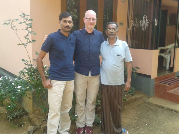 Im Dezember erreichte uns die Nachricht, dass Kollege George von Organic Waynad in einen Motorradunfall verwickelt wurde und sich dabei eine sehr schwere Verletzung seines Fußes zugezogen hatte. Er ist seitdem nicht arbeitsfähig und fällt bei Organic Wayanad erst einmal aus, und das ausgerechnet genau zur Kaffeeernte. George ist Hauptverantwortlicher bei Organic Wayanad und kümmert sich vor allem im Büro um die Aufarbeitung und Auswertung der Farmdokumentationen und Besuchsberichte. Er hatte uns bei meinem letzten Besuch die ganze Woche über begleitet und war nicht nur aufgrund seiner guten Englischkenntnisse sondern vor allem aufgrund seiner Herzlichkeit ein toller und kompetenter Kollege. Daher lag es mir sehr am Herzen, ihn während meines Aufenthaltes zu besuchen und mich nach seinem Gesundheitszustand zu erkundigen. Er wohnt ca. eine Stunde Autofahrt nordwestlich in der Region Kattikkulam. Als wir auf den Hof seines Hauses rollten kam er uns schon humpelnd entgegen um uns zu begrüßen. Nach diesem herzlichen Wiedersehen setzten wir uns im Haus bei Kaffee, Tee und diversen Süßigkeiten zusammen. Der Heilungsprozess macht zum Glück gute Fortschritte und er kann diese Woche zum ersten Mal ohne Krücken gehen. Für die Hartgesottenen gab es dann noch auf dem Handy Vorher- Nachherfotos. Glücklicherweise gibt es in Kalpetta eine Klinik, die sich auf Hauterkrankungen und plastische Chirurgie spezialisiert hat und ihn so gut versorgt. Ist zwar jedes Mal eine lange Fahrt dorthin aber so wie es aussieht kann er hoffentlich im März wieder arbeiten.